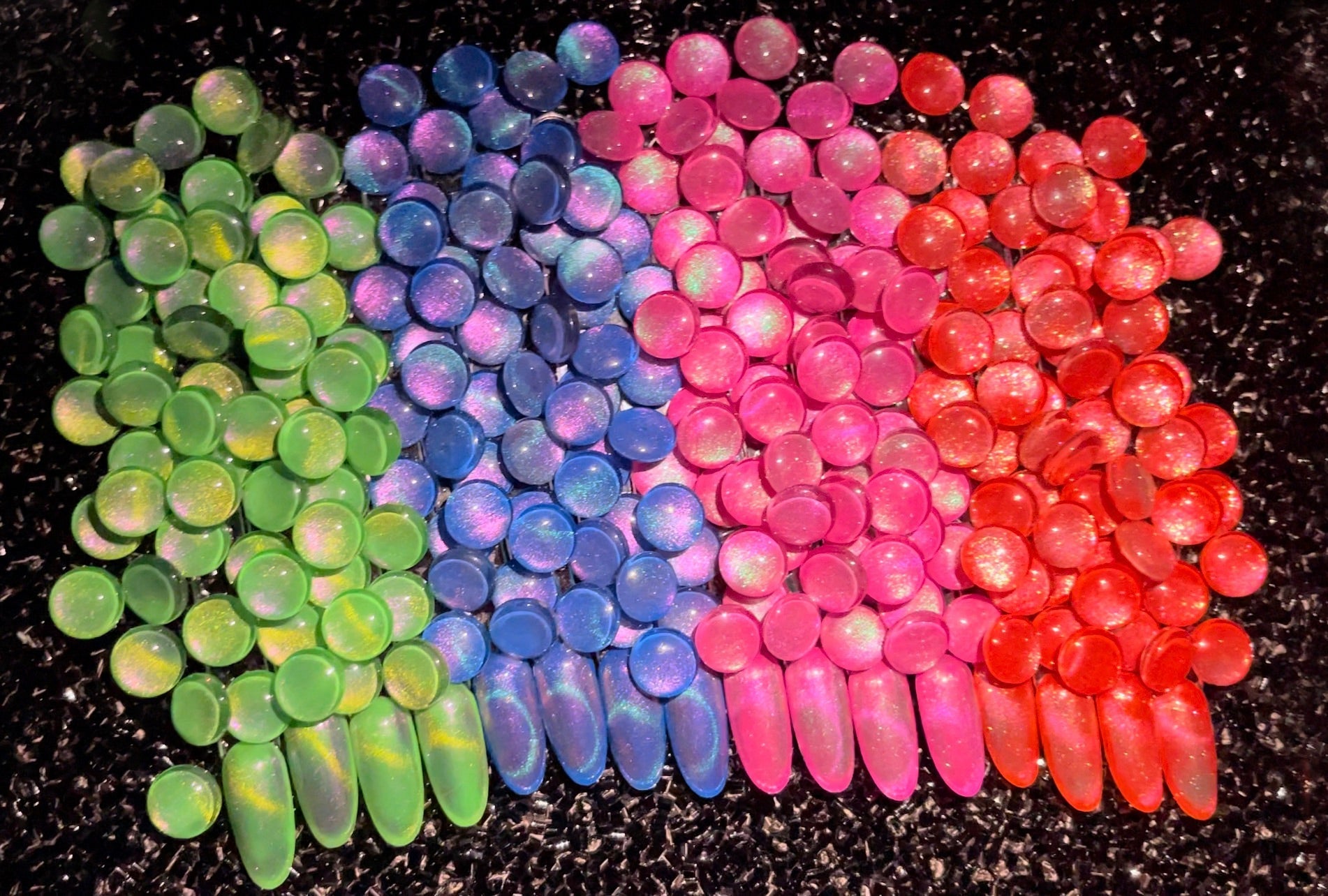 COLOR: MIRROR IMAGE MEDUSA - opalescent, very fine shimmer, NOT glitter. This polish is very sheer. If you put it over a natural nail, it will be milky white with snake green and purple halo. If you put it over a color, it will make that hue have an opalescent quality.