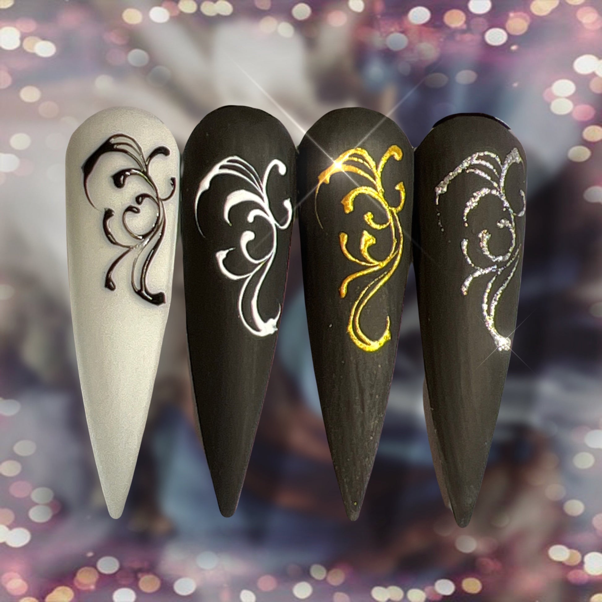 They’re perfect for scroll work as they cure to a tack-free finish. They’ll also hold your chrome powders BEAUTIFULLY and provide a rich finish to any art work.