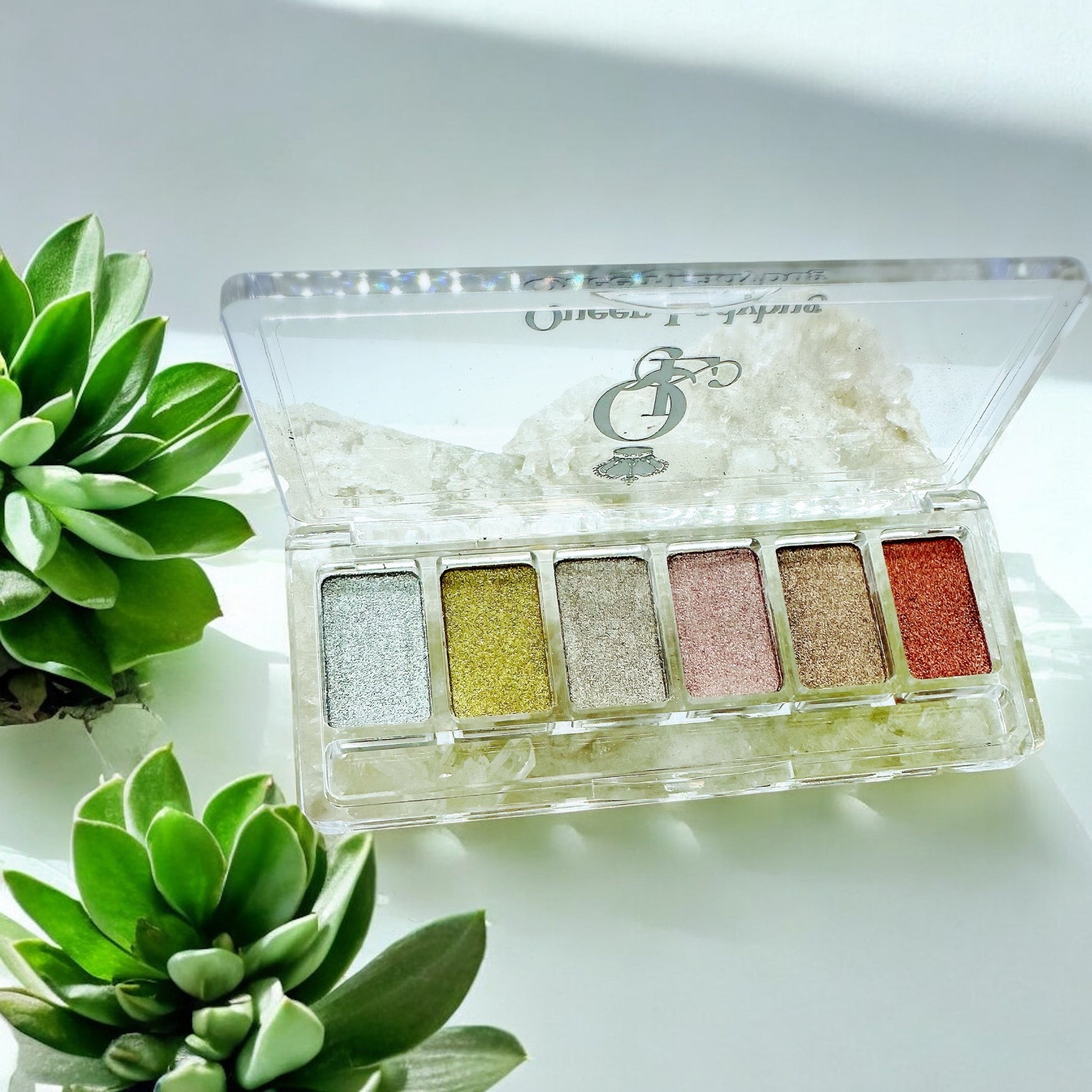 This palette consists of the six colors shown and are pressed, chrome pigments. Budget friendly and makes for a lovely shine over top of your favorite colors.